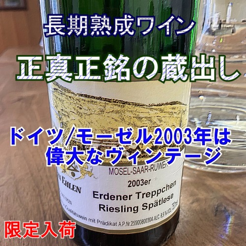 2003年はモーゼルにとって偉大なヴィンテージ⇒2003VTのモーゼルは、凝縮感のある風味が楽しめる偉大なヴィンテージとして評価されています。『ワイン エンスージアスト』のヴィンテージチャートは 93 点、『ワイン スペクテーター』のヴィンテージチャートでは、「ドイツ:リースリング」は 94 点といずれも高評価です。
